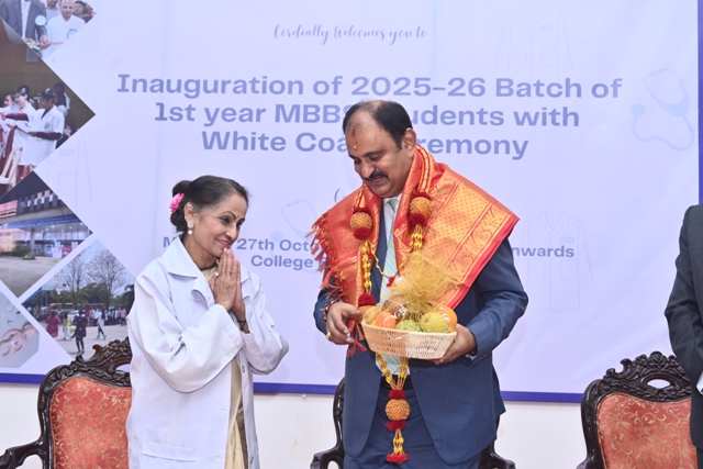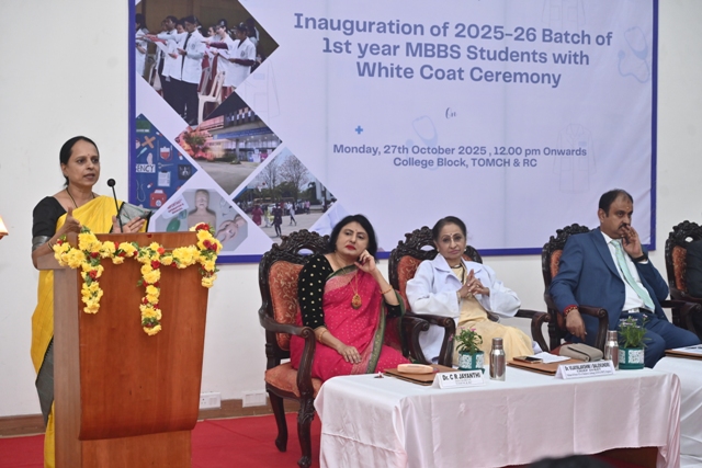 Chief Guest Dr. Vijayalakshmi I. Balekundri, Professor Emeritus and Former HOD of Pediatric Cardiology at SJICR and BMCRI, reminded students of the sanctity of the white coat and the moral strength required to uphold its values. Her reflections on dedication and endurance deeply resonated with parents and students alike.