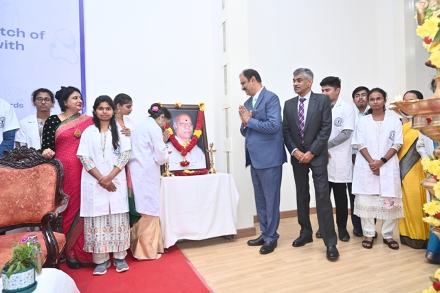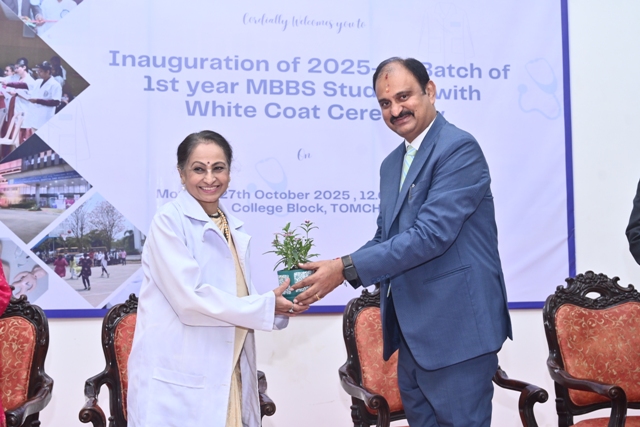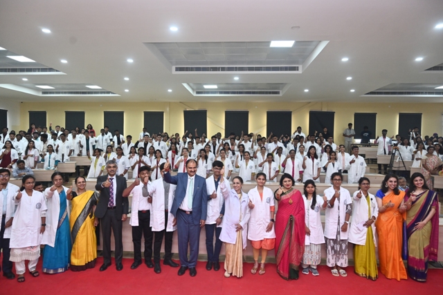 The special ceremony commenced with a soulful invocation followed by the Lighting of the Lamp, symbolizing the dispelling of ignorance through knowledge. Dean and Director Dr. C. R. Jayanthi welcomed the gathering with an inspiring address, urging students to embrace the journey ahead with empathy, integrity, and academic excellence. She highlighted that medicine, beyond being a science, is a vocation of humanity and lifelong learning.