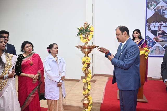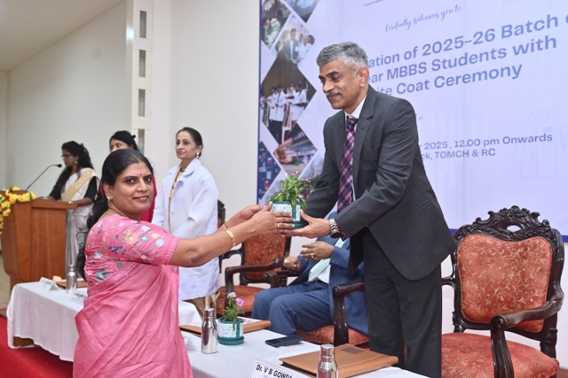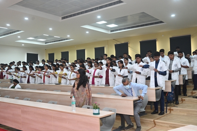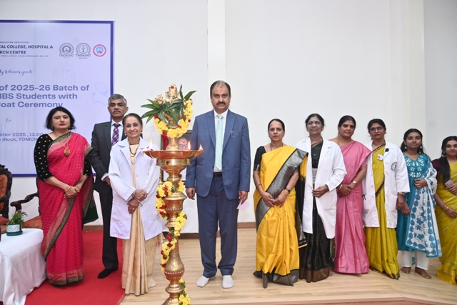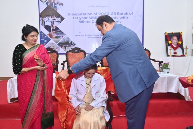 The special ceremony commenced with a soulful invocation followed by the Lighting of the Lamp, symbolizing the dispelling of ignorance through knowledge. Dean and Director Dr. C. R. Jayanthi welcomed the gathering with an inspiring address, urging students to embrace the journey ahead with empathy, integrity, and academic excellence. She highlighted that medicine, beyond being a science, is a vocation of humanity and lifelong learning.